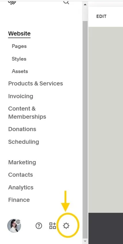 From the left-hand-side navigation bar within Squarespace, click on the gear icon to access your site’s Settings.