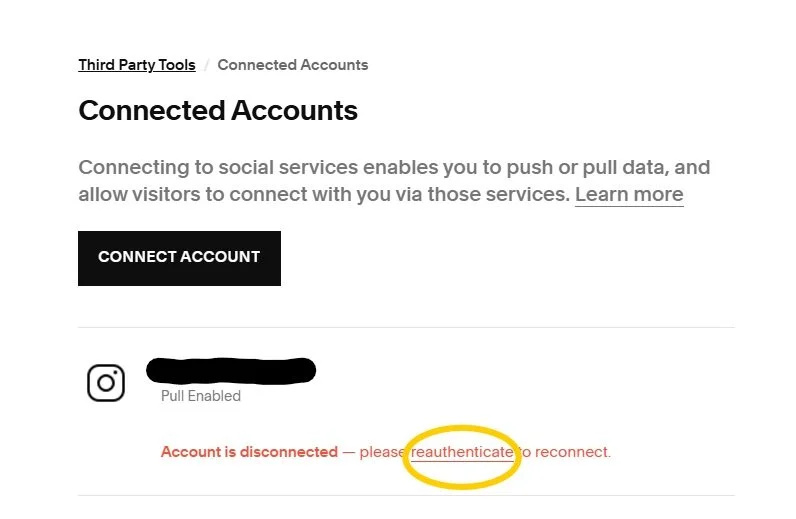 ONE LAST STEP: From this same page within Squarespace, click on your Instagram account and then click Reset Data.