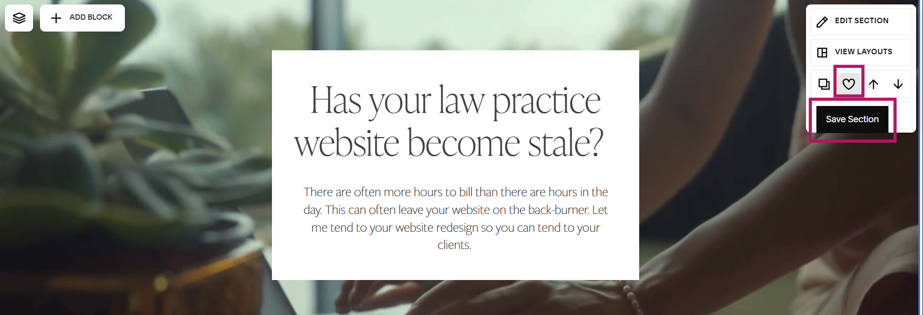 TIP: If you’re not using the pages and won’t be in the foreseen future, but you have content on those pages that you’ve been wanting to hang onto, Squarespace 7.1 allows you to save sections on a webpage! See photo below, top right corner. You’ll have to be in edit mode on the webpage to see the menu with the Save Section heart. Click the heart and your section is saved! Save the sections with the content you want keep, then delete the page.