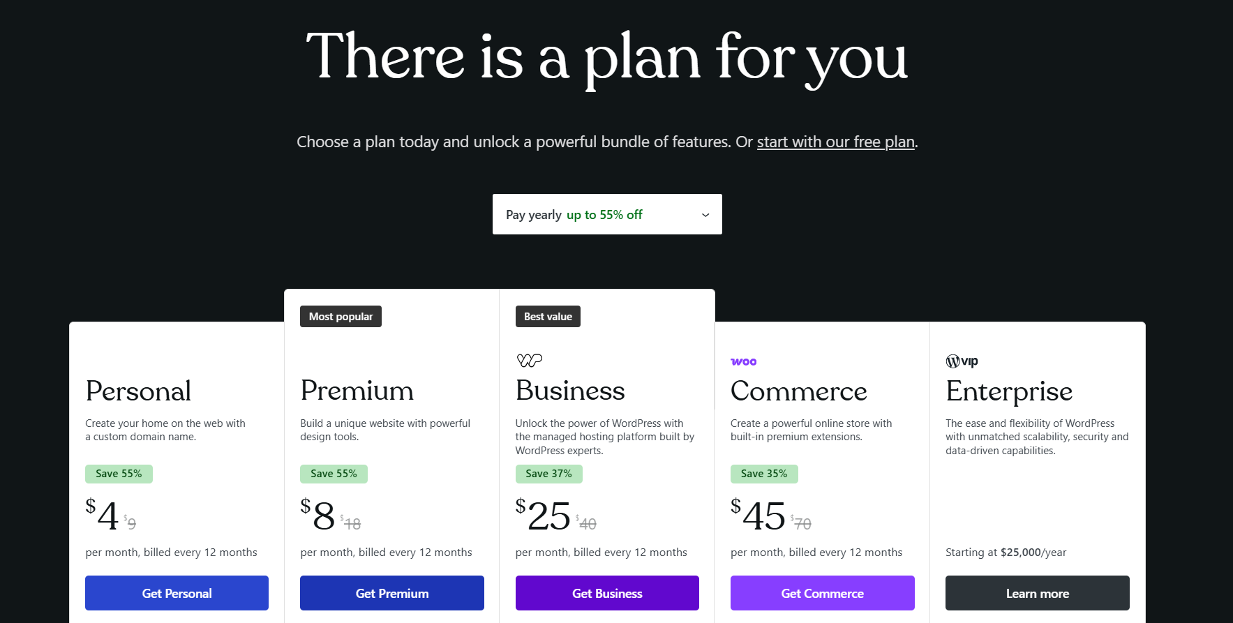 Full CMS platforms like WordPress have options from free to a monthly charge to use, and they often require additional paid components such as premium themes, plugins, and hosting.